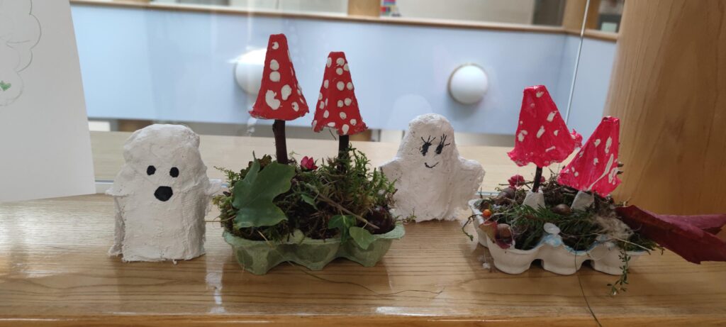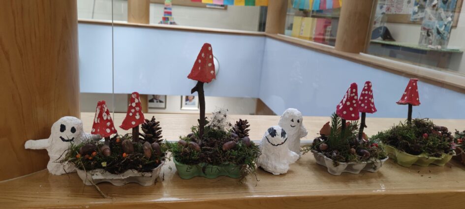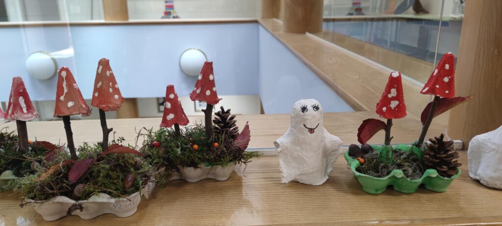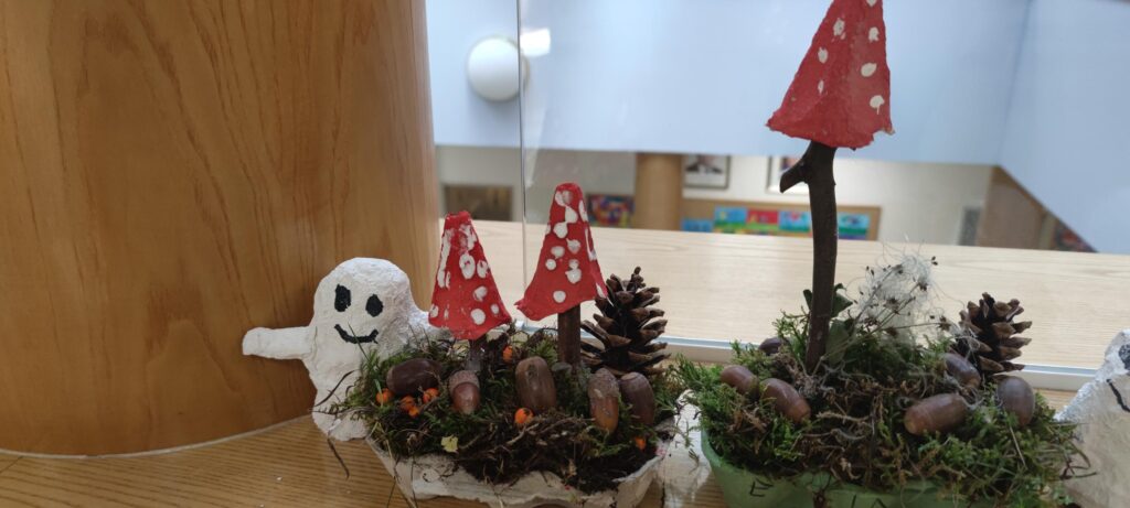 Die Kinder der 4. Klasse haben im Fach Technik und Design eine Herbstdekoration aus Naturmaterialien und lustige Gespenster aus Gipsbinden gebastelt.