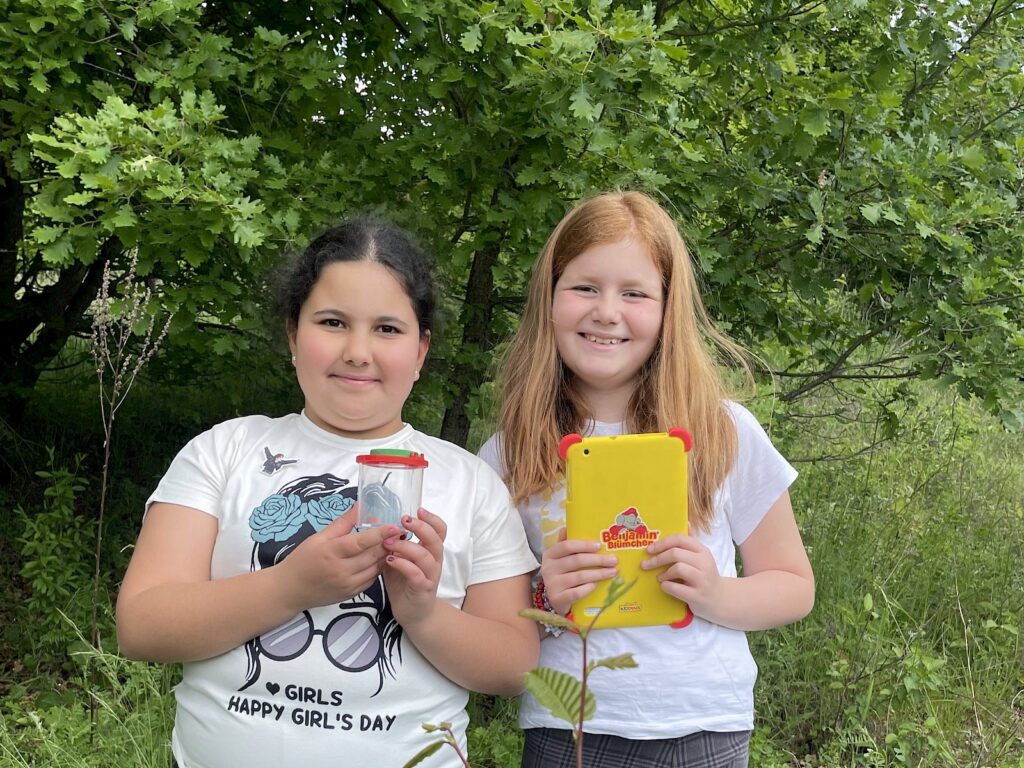 Dann ging der praktische Teil endlich los. Ausgestattet mit Becherlupen, Tablets und der iNaturalist-App begaben sich die Schüler:innen auf Entdeckungstour. Mit großer Neugier durchstreiften sie das hohe Gras und entdeckten zahlreiche Tiere und Pflanzen. Diese wurden fotografiert, in die App hochgeladen und werden dort von Expert:innen bestimmt. Zu den besonderen Funden des Tages zählten unter anderem Rosenkäfer, Hundertfüßler, Streifenwanzen, Soldatenkäfer und ein Schwarzer Erdbock.
