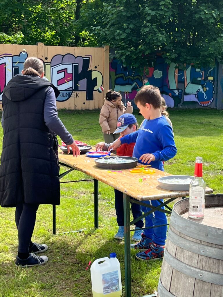 Basketballstation, beim Frisbeeschießen und mit den Seifenblasen.